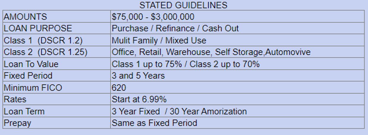 Our STATED loan program is ideal for investors or owner occupied properties where there is a lack of income support in the client's tax returns or if the client is credit challenged .  STATED loans generally close faster than full documentation loans.  In many cases, banks have no interest in financing these properties - even with good credit.